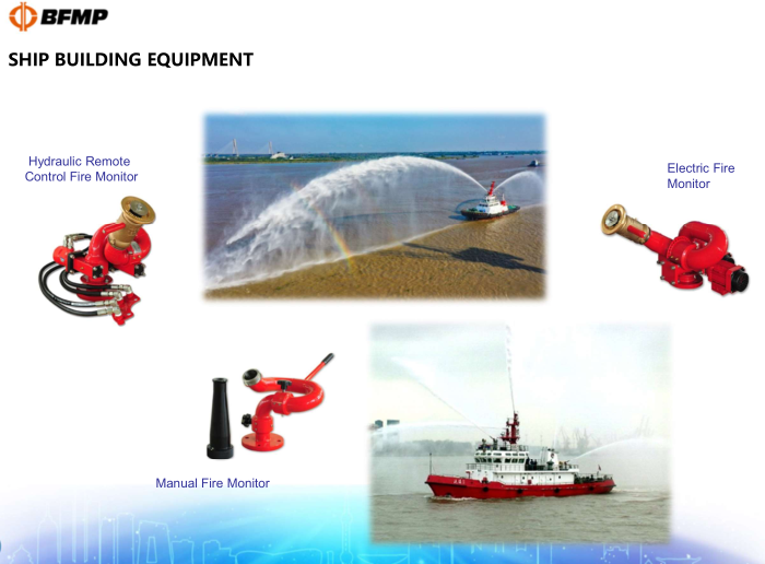 Our company can provide hydraulic fire gun, manual fire gun, electric fire gun and mobile fire gun.  At present, the company has been equipped with the fire system of the ship type: multi-purpose offshore work ship, multi-purpose supply ship, offshore oil platform, 10,000-ton chemical ship, full-time fire ship, military ship and so on
