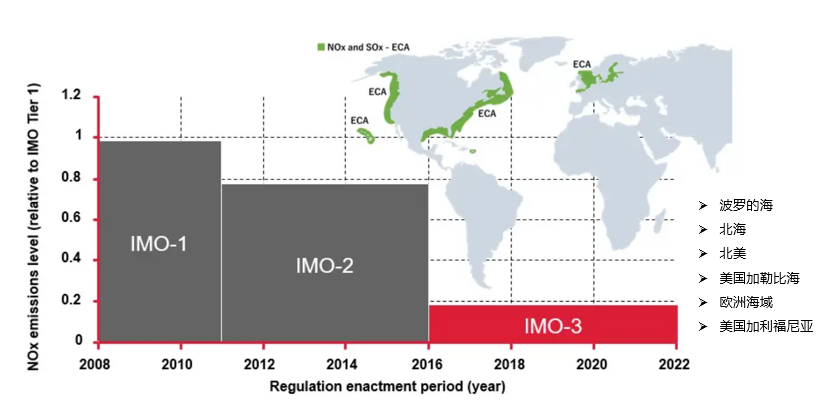 針對國際:根據國際海事組織(IMO)海上環(huán)境保護委員會第66屆會議(MEPC66)以及MEPC.251(66)決議通過MARPOL附則VI和2008NOx技術規(guī)則修正案,并于2015年9月1日起生效實施。進入排放控制區(qū)的船舶滿足《國際防止船舶造成污染公約》第三階段氮氧化物排放限值要求。